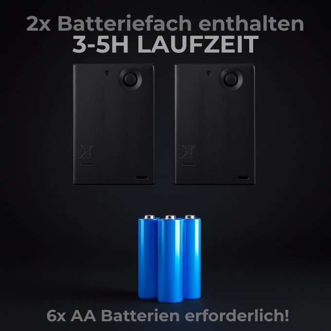 Die Handschuhe verwenden 2 AA-Batterien pro Handschuh. Wir empfehlen wiederaufladbare Akkus für nachhaltige Nutzung.
